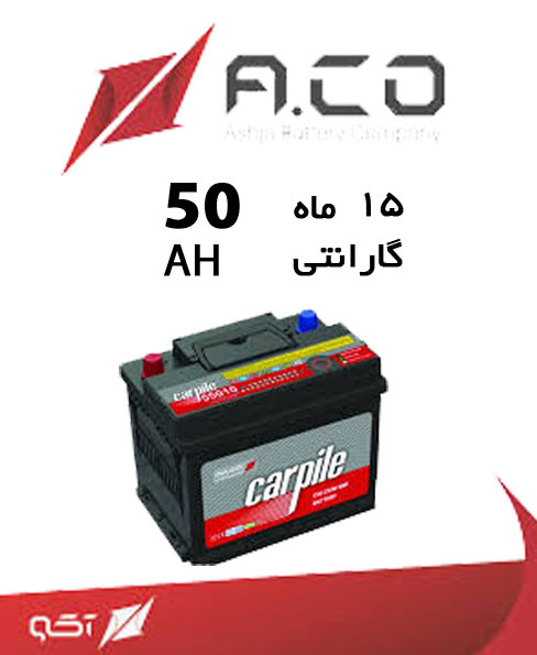 باتری خودرو 50 آمپر کارپیل با کد محصول C-55010 در سایز استاندارد L2 در گروه کارخانجات آکو باتری تولید شده است. این باتری ماشین، گارانتی 15 ماهه دارد. مدل باتری 50 آمپر ساعت از جمله پر فروش ترین باتریهای تولید شده در کشور است چرا که قابلیت مصرف بر روی خودرو های پراید و انواع پژو 206 با مدل های ذکر شده را دارد.